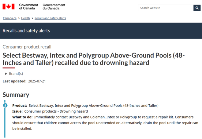 近日,加拿大卫生部已对多款地上式泳池进行大规模召回,涉及Bestway、Intex、Polygroup这三大热销品牌的特定型号,原因是这些泳池存在严重的设计缺陷,可能让儿童在无人看管时自行攀爬入池,造成溺水事故。