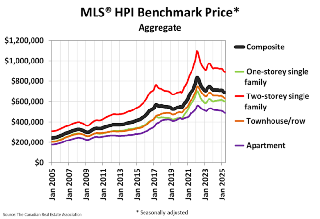 全加国房价回调,6月份综合基准价格下跌0.2%(下跌1,600),至688,600加元。2025 年 2 月、3 月和 4 月连续三个月环比下降近 1% 。