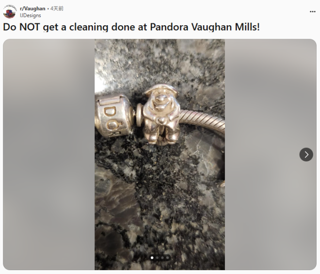 据这位网友描述,她带着自己心爱的手链和串饰,前往Vaughan Mills的潘多拉专卖店,希望进行一次专业的清洁保养。