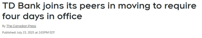 TD称,从10月6日起,助理副总裁(associate vice-president)级别及以上的员工将被要求每周到办公室工作4天;而非高管级别的同事,大部分将被要求从11月3日起开始增加到办公室工作的天数。