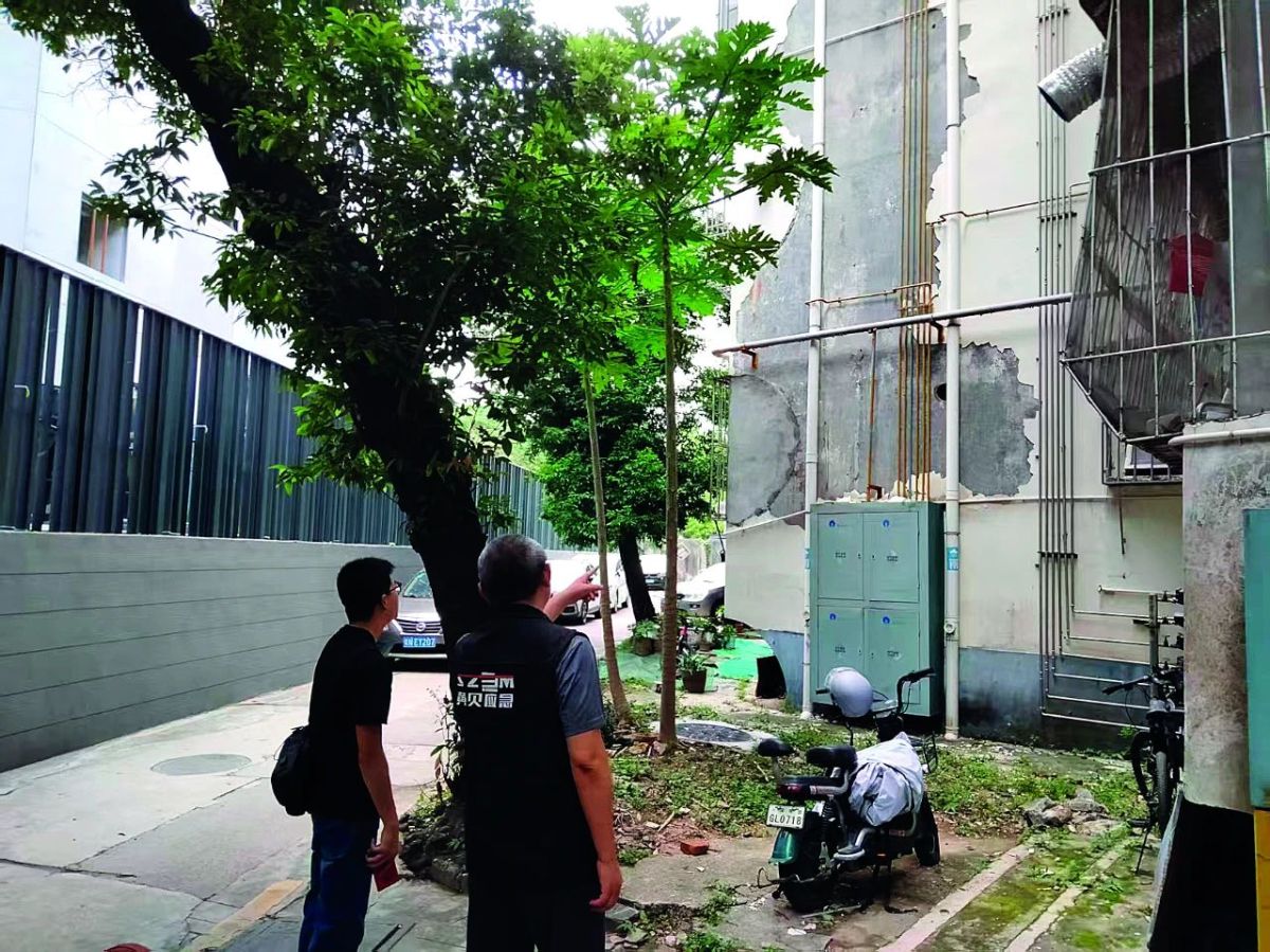 深圳罗湖区黄贝街道工作人员查看墙皮脱落的老楼。图/受访者提供