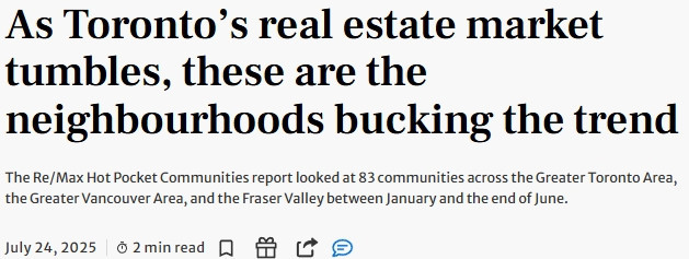 周四(7月24日)发布的报告考察了2025年1月至6月底期间,大多伦多地区、大温哥华地区和菲沙河谷的83个社区。