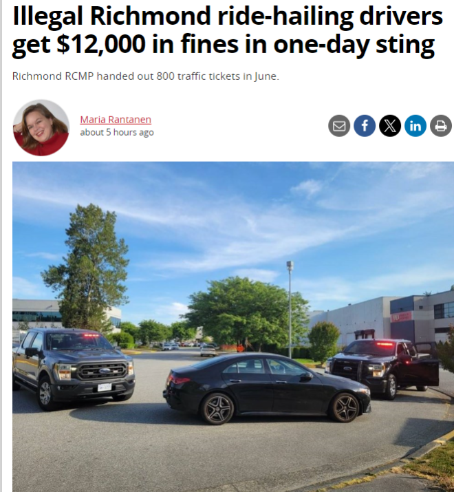 据Richmond News报道,最近一次列治文皇家骑警的突击行动(6月中旬),总计对非法网约车司机开出了超过$1.2万元的罚单。