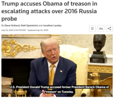 此前,美国国家情报总监加巴德7月18日宣布解密部分情报文件,显示奥巴马时期的情报体系“存在政治化运作”。随后,特朗普于7月19日和20日连续在社交媒体发文,直接点名指控奥巴马“叛国”,称“奥巴马滥用权力操控情报系统,伤害美国民主根基”,要求彻查。奥巴马阵营则回应称指控“荒谬且毫无事实依据”,是“赤裸裸的政治操弄”, 强调“通俄门”调查结论已通过跨党派确认,批评特朗普为选举利益制造“虚假叙事”。
