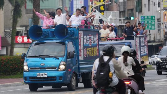 頂圖:台灣立法委員傅崐萁罷免案投、開票結束,傅崐萁在正式公布前,自行宣布罷免案不通過,隨後在花蓮市區沿街謝票。中通社