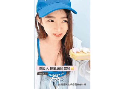 台灣「童顏巨乳」郭書瑤(瑤瑤)有着精緻五官及E Cup驕人身材,不時在社交網派福利。日前她與友人到小琉球遊玩,被好友出賣火辣身材,身穿藍色低胸背心的她,面帶嬌羞地享用烏龜造型冰淇淋,事業線深不見底,好友搞笑地為她配字寫道:「垃圾人,把龜頭吃掉」,又圈起褲鏈位置吐槽她:「拉鏈還沒拉好,你到底在幹嘛」。
