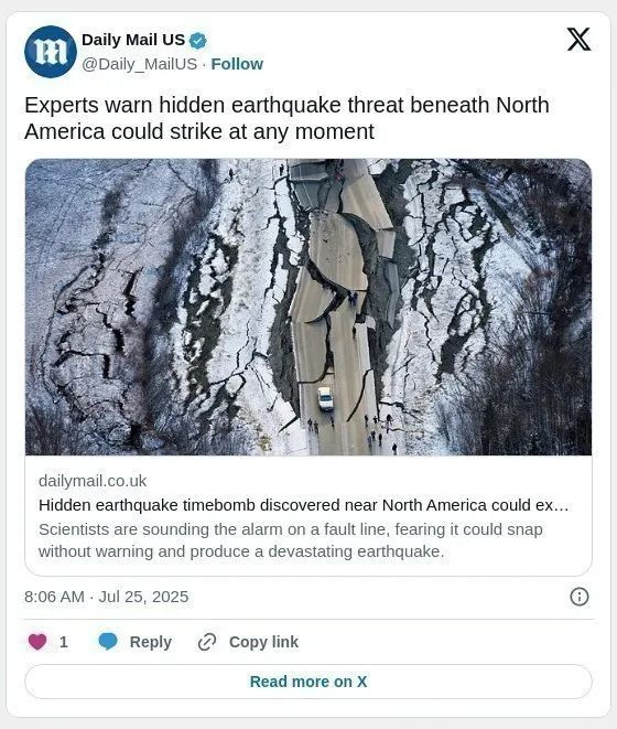 阿拉斯加地震中心首席地震学家迈克尔·韦斯特博士(Dr. Michael West)在接受《每日邮报》采访时表示。“这项研究显示,这条被忽视的断层实际上在悄悄积蓄力量,可能正走向一次极具破坏性的释放”。