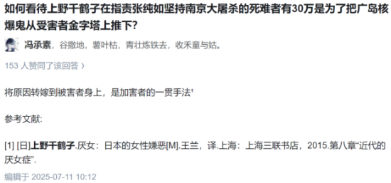 所以美西方對納粹屠殺和日軍屠殺長期持雙重標準,認為南京大屠殺是“東亞的前現代化社會中常見的征服與屠殺,與現代性無關,不值得討論”(見戴錦華相關采訪)。所以上野千鶴子這種打著馬克思主義旗號的會指責張純如堅持南京大屠殺的死難者有30萬是為了“把廣島核爆從受害者金字塔上推下去”。被原子彈炸死就是現代死法,就值得反思了,是吧?