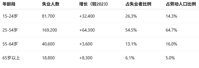 更加令人担忧的是,在失业大增的同时,空缺职位却锐减了8.1万个(下降41%),市场恶化严重。魁北克政府可能会对批评者强调:虽然失业率从4.3%涨到6.3%,但魁省目前的失业率仍低于全国平均水平(6.9%),也低于安省的7.8%。但专家警告:这并不代表魁省的就业形势乐观。安省失业人数两年增长46%,全国整体增长34.6%,而魁省的54%增长幅度远高于其他省份,显示出结构性问题。年轻人高失业,年长者难重返职场从年龄分布来看,15至24岁的年轻人失业问题不容忽视。他们虽只占劳动人口的14.3%,却占到失业者的26.3%,接近两倍的过度比例。