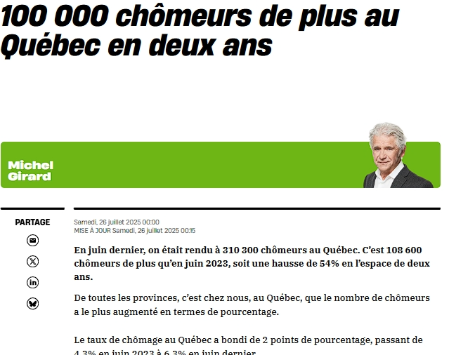 文章还警告说,就业市场动荡可能只是开始。美国总统特朗普重新发起对加拿大的关税攻势,对制造业、出口业、物流行业构成严重冲击。这不仅将影响工厂岗位,更可能波及魁省的中小企业与服务行业。