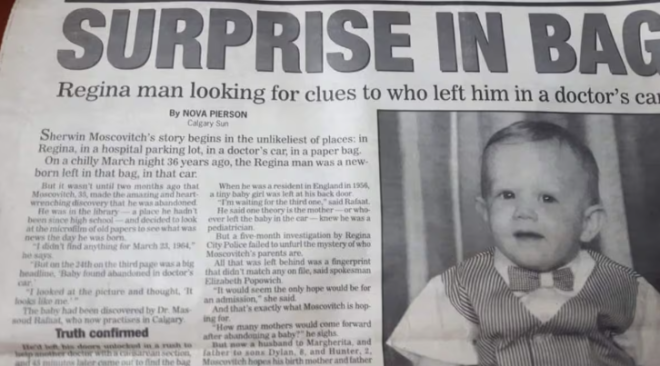 这名居住在萨省里贾纳市的男子名叫Sherwin Moscovitch,早在幼年时期就知道自己是被收养的。他回忆说,大约在五岁时,养父母坦然告诉他自己是领养来的。然而,这一身份从未给他的成长带来困扰,因为养父母对他以及其他几个被领养的兄弟姐妹都极尽关爱。