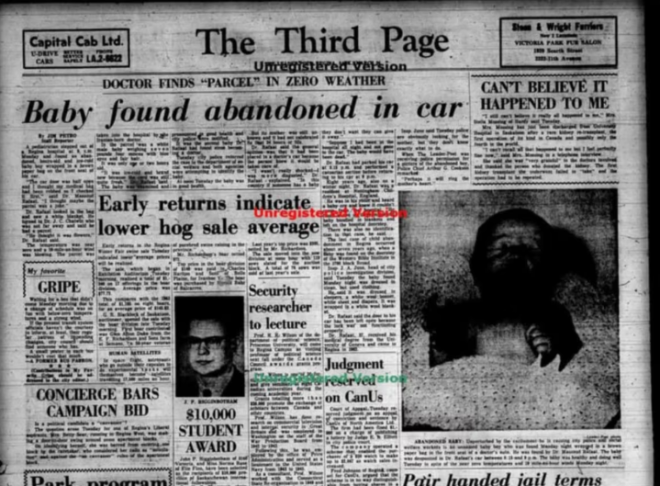 这篇报道描述,1964年3月23日清晨,一位医生完成紧急手术后返回位于里贾纳医院的停车场。当他打开自己汽车的前门时,意外发现座位上有一个纸袋。原以为是恶作剧,他打开纸袋后震惊地发现里面竟是一个新生儿,裹着毯子、穿着尿布,被安放在袋中。