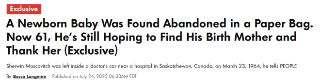 Moscovitch表示,真正令他震惊的是配图中的婴儿照片——那张脸与他自己小时候的照片如出一辙。“那看起来就是我,”他说。