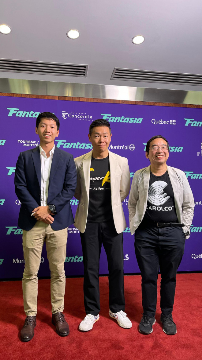 香港驻多伦多经济贸易办事处(香港经贸处)支持五部香港电影在加拿大满地可举行的2025 Fantasia国际电影节放映。图示香港经贸处署理处长杨江锋(左)、《触电》的编剧及演员罗浩铭(中)及Fantasia国际电影节亚洲节目共同总监King-wei Chu(右)于七月二十七日在加拿大满地可Concordia Hall Theatre合照。