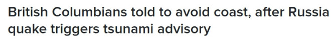 俄罗斯东南部沿海发生8.8级,引发了环太平洋地区的警告和警报。加拿大卑诗省居民被敦促远离仍处于海啸警报(tsunami advisory)下的沿海地区。