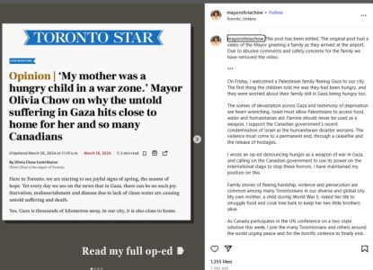 市長的Instagram帖子還包括了她於2024年3月為《星報》撰寫的一篇評論文章的截圖,其中她將加沙人所遭受的苦難與她自己家人在二戰期間在中國對抗飢餓的掙扎相提並論。