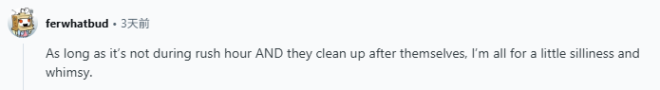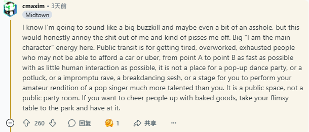 “我知道我这么说会让人觉得很扫兴,甚至有点混蛋,但说实话,这真的会让我很恼火。这里弥漫着‘我是主角’的氛围。公共交通是为了让那些疲惫不堪、劳累过度、筋疲力尽、甚至可能负担不起汽车或Uber的人们尽可能快地从A点到达B点,并且尽可能减少人与人之间的互动,它不是一个举办舞会、聚餐、即兴狂欢的地方,也不是一个让你表演的舞台。这是一个公共空间,而不是一个公共派对场所。如果你想用食品让人们开心,那应该带着你的桌子去公园里。”