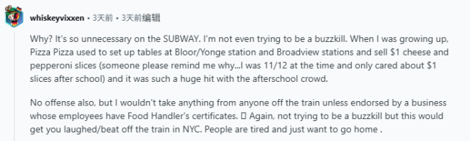 “为什么要这么做?在TTC上完全没必要……无意冒犯,但我不会接受地铁上任何人的任何东西,除非是由持有食品处理员证书的企业员工提供的。再次重申,我并不想扫大家的兴,但在纽约,这样做会被人嘲笑或赶下车。人们都累了,只想回家。”