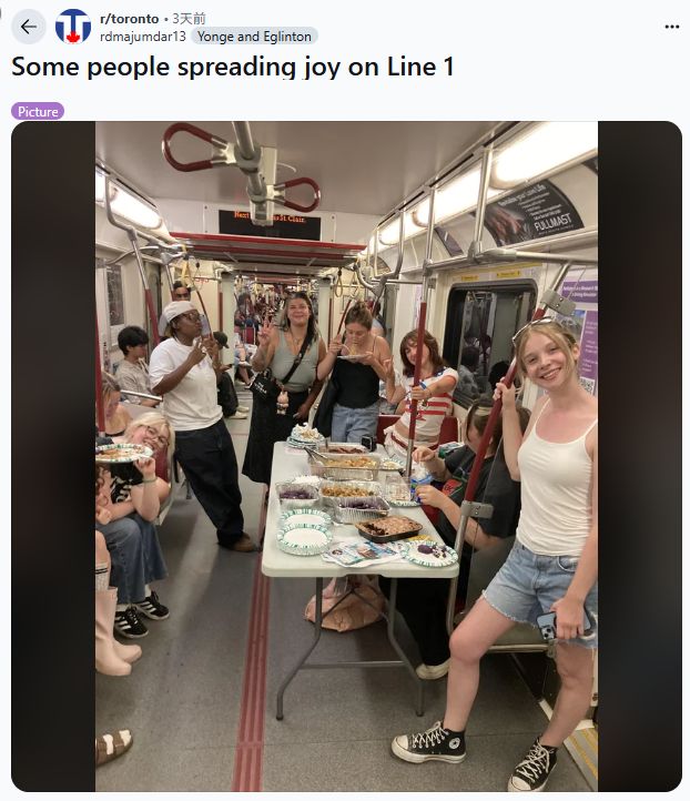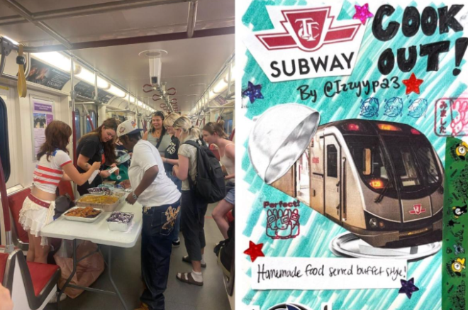 近日,多伦多一位25岁的妹子Isabella Petraglia带着9位闺蜜、几锅热气腾腾的家常菜,和一张大折叠桌——直接在TTC上来了一场“快闪自助餐”!