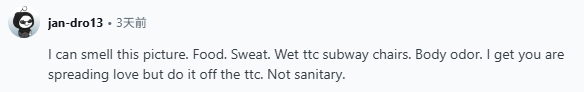 “我能闻到这张照片的味道。食物、汗味、潮湿的地铁椅子、体味……我知道你在传播爱,但别在TTC上。不卫生。”