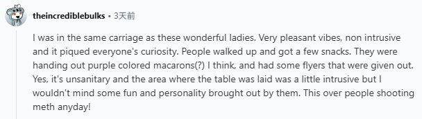 “我和这些可爱的女士们同坐一节车厢。气氛非常愉快,没有打扰其他人,而且激起了每个人的好奇心。人们走上前去拿了一些小吃。她们在分发紫色的马卡龙?是的,这并不卫生,摆放桌子的地方也有点碍事,但我不介意他们带来一些乐趣和个性。比那些在车厢里吸毒闹事的强多了。”