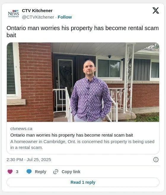 加拿大安大略省坎布里奇市(Cambridge, Ont.)一名业主近日发现陌生人频频上门,担忧他刚购买的新家可能正被用于某种租赁诈骗活动。