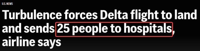 据报道,达美航空一趟由盐湖城飞往阿姆斯特丹的航班,在飞行途中遭遇严重气流,短短85秒内急坠1,600英尺(约合500米),机上乘客和餐车被抛飞、撞击,导致25人送医。
