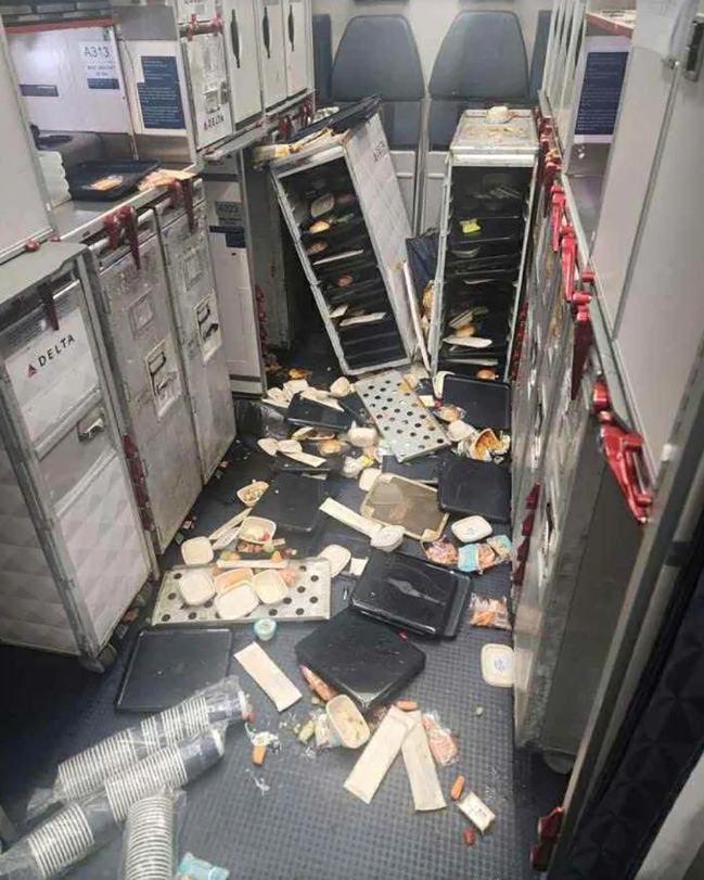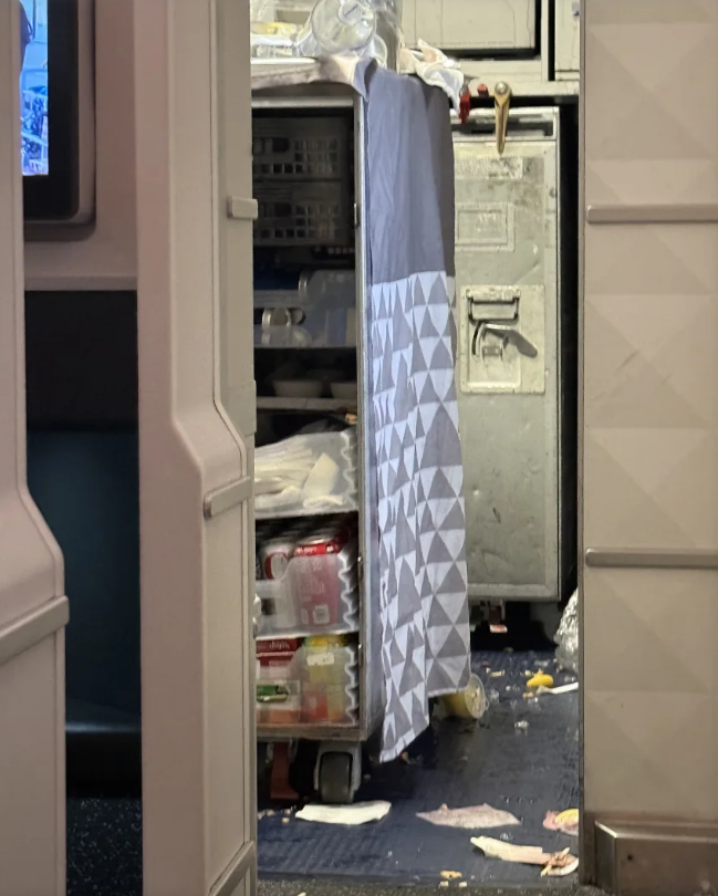还有乘客拍摄了机舱后部的照片,食物、饮料、杂物散落满地,一片狼藉。