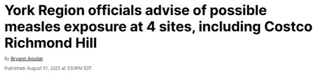 约克区公共卫生官员发布通告,提醒公众四处地点可能存在的麻疹(measles)风险,其中包括位于列治文山的一家Costco超市。