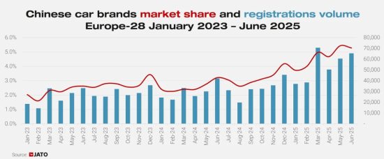 7月末,行業研究機構JATO Dynamics發布的最新分析顯示,今年上半年,28個歐洲國家(包括英國)的新車注冊中,有5.1%為中國品牌,創歷史新高,較去年幾乎翻倍。