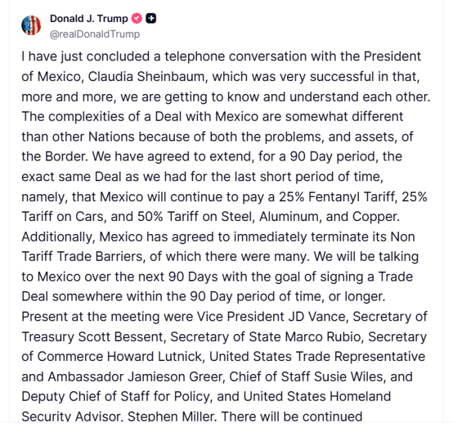 美国总统周四宣布,在与墨西哥总统Claudia Sheinbaum通话后,双方将启动为期90天的谈判期,而当前对墨西哥商品征收的25%关税将继续维持不变。