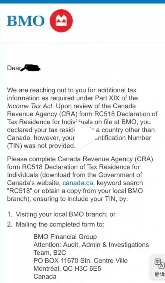 一般来说,CRS/FATCA协议会要求税务居民所在金融机构向其征集信息,因此刚刚那名网友才会收到来自银行,而不是CRA的邮件。