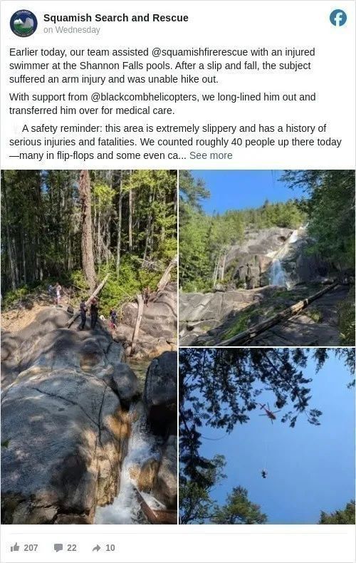 在过去的两天里,斯阔米什搜救队处理了多起与瀑布相关的事故——有人在瀑布附近的水池或边缘滑倒坠落。一些人受伤程度不一;其中一人非常幸运地毫发无损(见下图)。