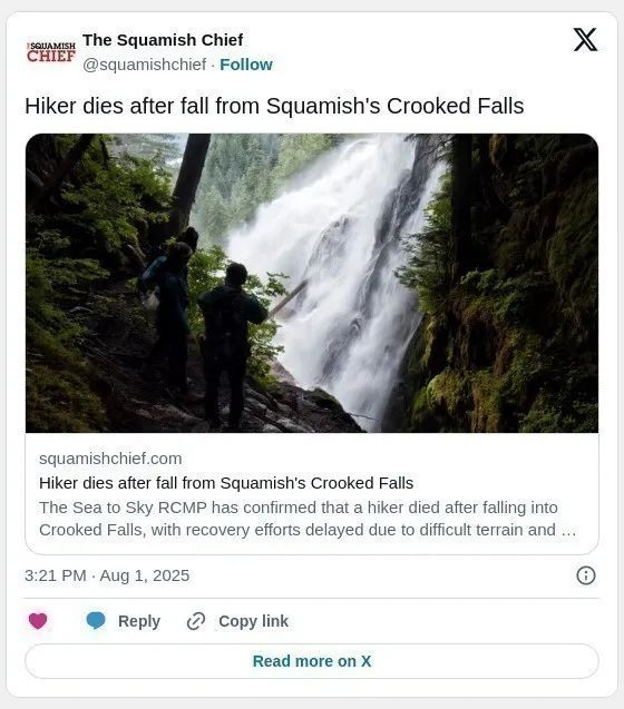 据海天皇家骑警(Sea-to-Sky RCMP)的简短声明,救援队于周四晚接到一名徒步旅行者坠入弯曲瀑布(Crooked Falls)的报告后赶赴现场,发现该人已当场死亡。