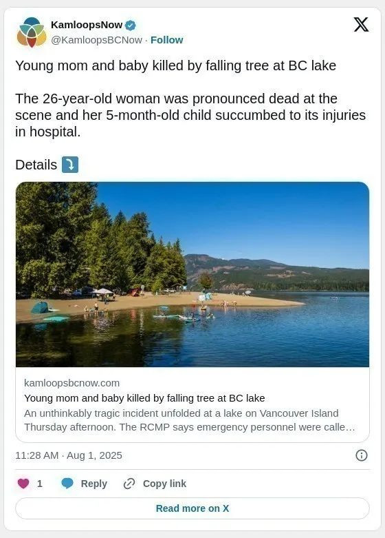 (加西网简讯)昨天,温哥华岛科莫克斯湖附近发生一起悲慢,一名年轻母亲和她五个月大的孩子被倒下的树木砸中身亡。