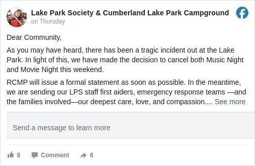 周四晚,湖滨公园协会和坎伯兰湖滨公园露营地发布了一份社区通知,鉴于湖滨公园发生的悲剧,取消原定于周末举行的音乐之夜和电影之夜将取消。