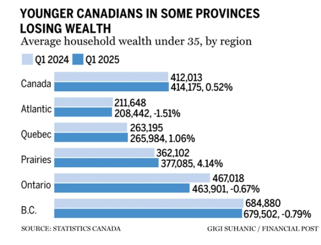 不过,草原省份是一个例外。在阿省和萨省,35岁以下人群的家庭净资产增长了 4.14%,甚至超过了45–64岁的中年群体。