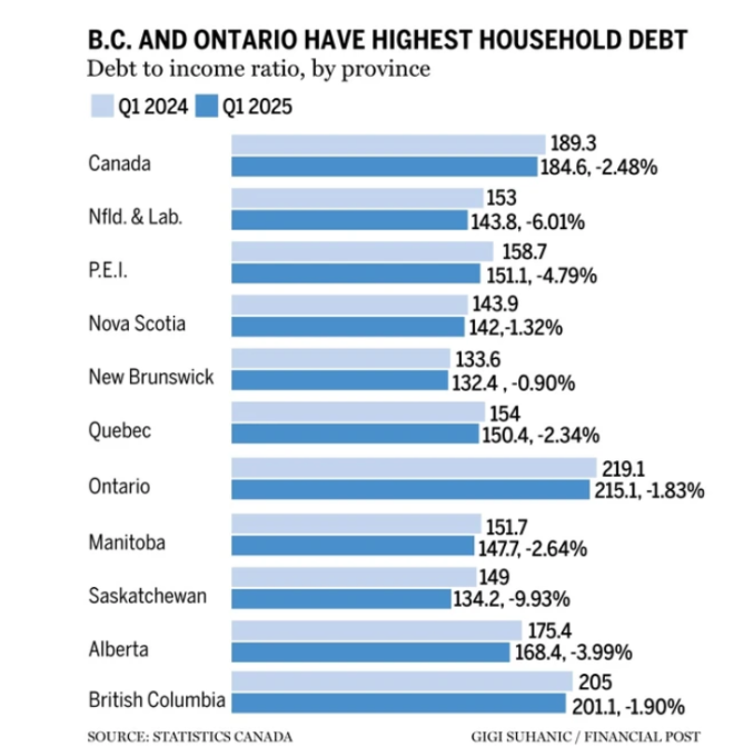 在全国范围内,安省和BC省的家庭债务收入比也是最高,特别是在多伦多和温哥华等高生活成本城市,许多家庭难以承受日常开支。