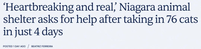 安省尼亚加拉地区的一家动物收容所在短短4天内接收了76只被遗弃的猫,现在正向公众求助。