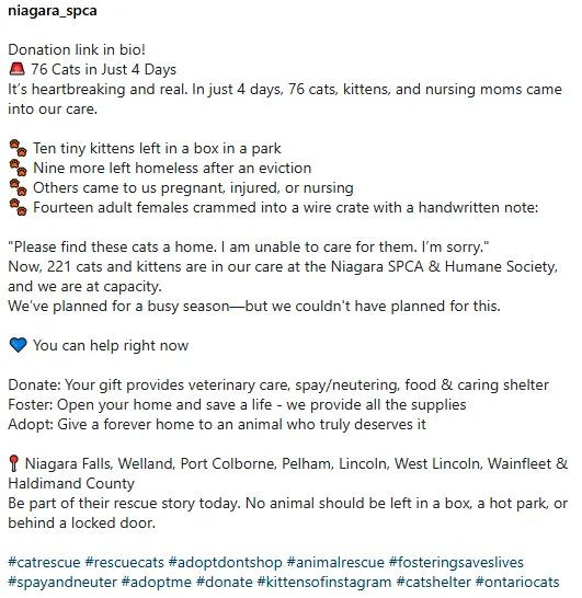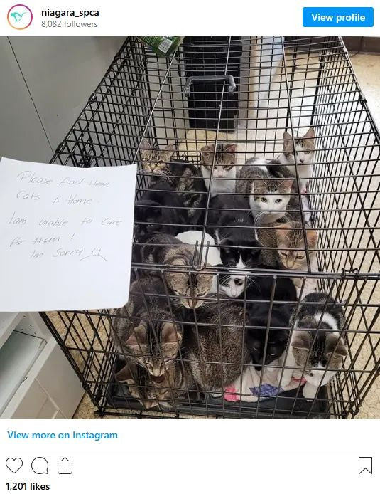 尼亚加拉防止虐待动物协会(Niagara SPCA)及人道协会的动物护理经理塔米·加博里(Tammy Gaboury)在网上发出呼吁,表示收容所目前正在照顾数十只在短时间内被遗弃在社区里的猫咪和小猫。