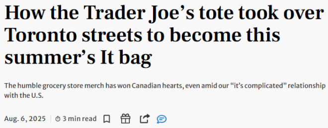 便如今加美贸易紧张、关税加码,但Trader Joe’s帆布袋的热度,依旧居高不下。这或许是一个信号:曾经高高竖起的贸易壁垒和“防备心”,在“真香”定律面前,可能正在悄然瓦解。
