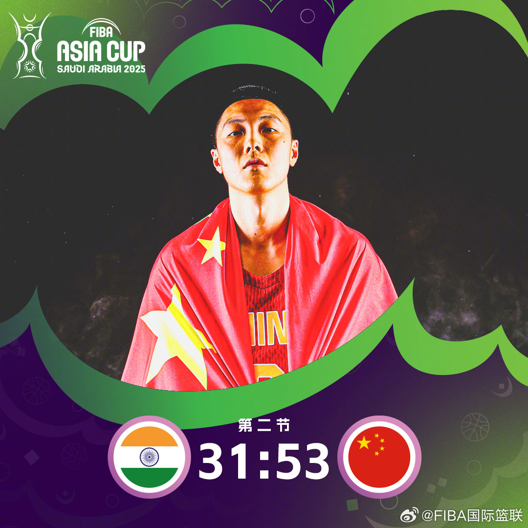 第二节,印度队加快进攻速度,利用攻守转换的机会缩小分差。王俊杰左侧45度命中止血三分,此后又妙传胡金秋上篮打成2+1。胡明轩续上外线火力,半场命中4记三分。中国男篮以53:31领先。