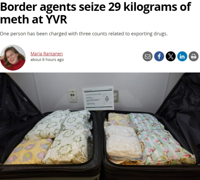 最近,温哥华国际机场又发生了一起“行李惊魂”事件,一名年仅25岁的中国籍旅客,在准备飞往香港的途中被边境服务局(CBSA)当场查获行李中藏有重达29公斤的冰毒——而且这些还“包装得像圣诞礼物一样精致”。估算下来,这些冰毒可以分成大约15万剂,数量惊人。