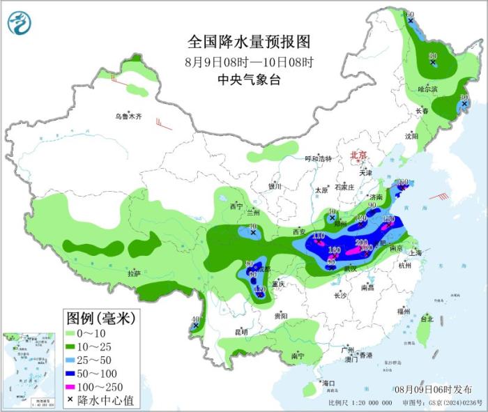 8月9日08时至10日08时,青海东南部、甘肃南部、川西高原北部、陕西南部、河南大部、山东东部和南部、湖北大部、安徽中北部、江苏中北部、四川盆地西部和南部以及黑龙江中北部、吉林东部、西藏东南部等地部分地区有中到大雨,其中,陕西南部、山东东部和南部、河南东北部和中南部、安徽中北部、江苏北部、湖北北部、四川盆地西部和南部等地部分地区有暴雨或大暴雨(100~200毫米)。新疆北疆北部和东部、山东半岛等地部分地区有4~5级风。黄海中部海域将有6~7级风、阵风8级,黄海南部海域、东海北部海域将有5~7级风、阵风8级,渤海、东海南部海域将有5~6级风、阵风7级。