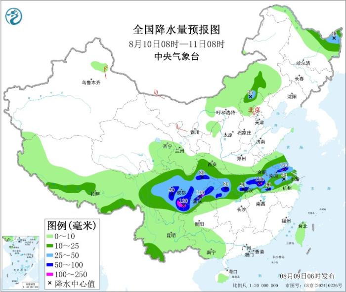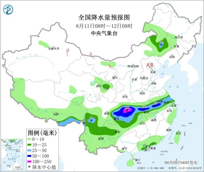 8月10日08时至11日08时,陕西南部、河南南部、四川大部、重庆大部、湖北大部、安徽中南部、江苏中南部、上海、浙江北部以及内蒙古东南部、黑龙江东北部等地部分地区有中到大雨,其中,安徽西南部、江苏中南部、湖北东部和西南部、四川盆地中东部和西南部、重庆中西部和东北部、云南东北部等地部分地区有暴雨或大暴雨(100~150毫米)。内蒙古西北部、新疆沿天山地区等地部分地区有4~5级风。东海北部海域将有5~7级风、阵风8级,黄海南部海域、东海南部海域将有5~6级风、阵风7级。
