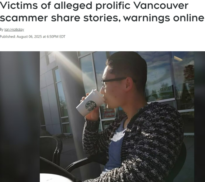 据CTV News统计,目前已有十多位受害人联系媒体或加入受害者群组。有的被骗卖咖啡机,有的签了假合同借给Jay几万刀,抵押品竟然是一辆查出来布满贷款记录、根本不能动的保时捷!甚至还有人被骗说对方狗狗要急救,钱在韩国转不过来,得借他一笔急用款。