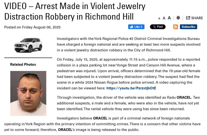 调查人员认为,Oracel是约克区一个外国人犯罪网络的成员。警方担心还有其他受害者尚未报案,因此公布了他的照片。