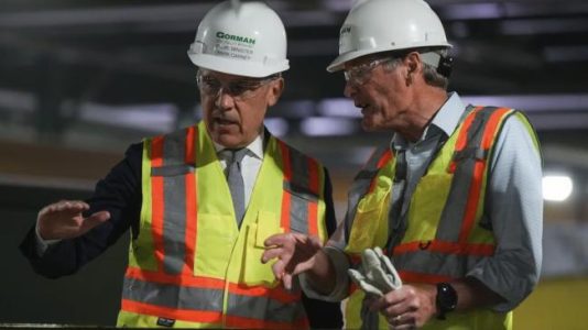 周五,加拿大總理卡尼,左,在BC省一間木材公司宣布,應對美國關稅,將對軟木業提供12億加元支持。照片:The Canadian Press / Darryl Dyck