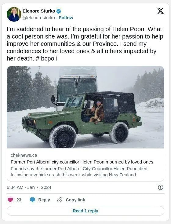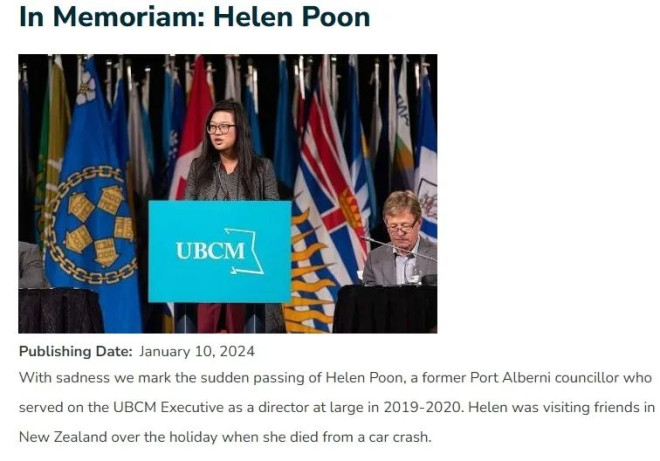 BC省阿尔伯尼港(Port Alberni)前市议员潘海伦(Helen Poon)在旅行期间发生严重车祸,抢救无效于2024年1月4日逝世。 近日,当地验尸官调查发现,”反社会“司机损坏道路标志造成这名加拿大游客惨死。