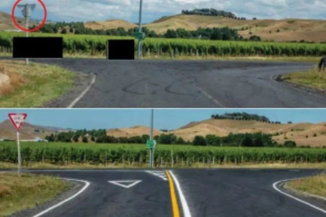 警方报告显示该路口是反社会驾驶行为频发的地点,当局提醒司机的让路道路标志被“完全抹去”,道路左侧的“让路”标志被旋转了约90度,遮挡了南行车辆的视线。